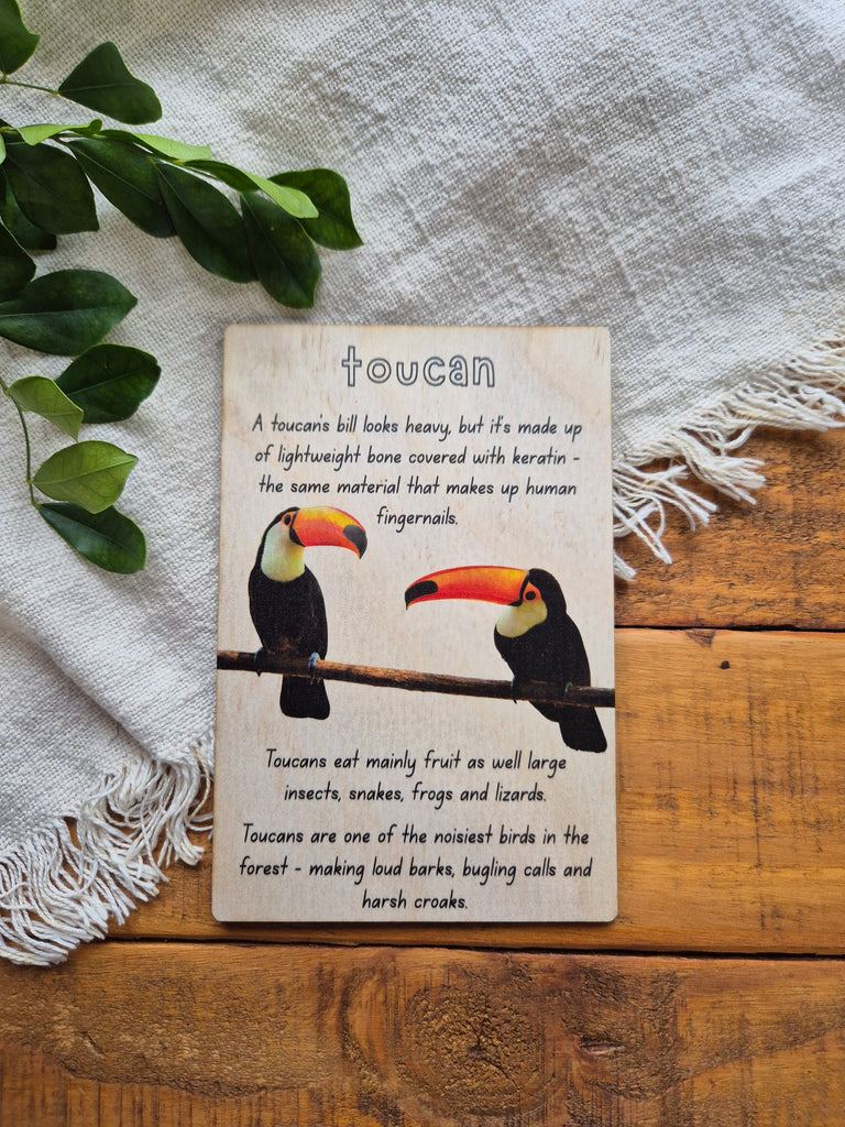 Our double sided toucan info card features weird & wonderful facts about this tropical creature as well as a beautiful watercolour image & a real life image on the reverse side. Learn about the toucan, how & where they live as well as their features. Info cards are available in packs or singles.