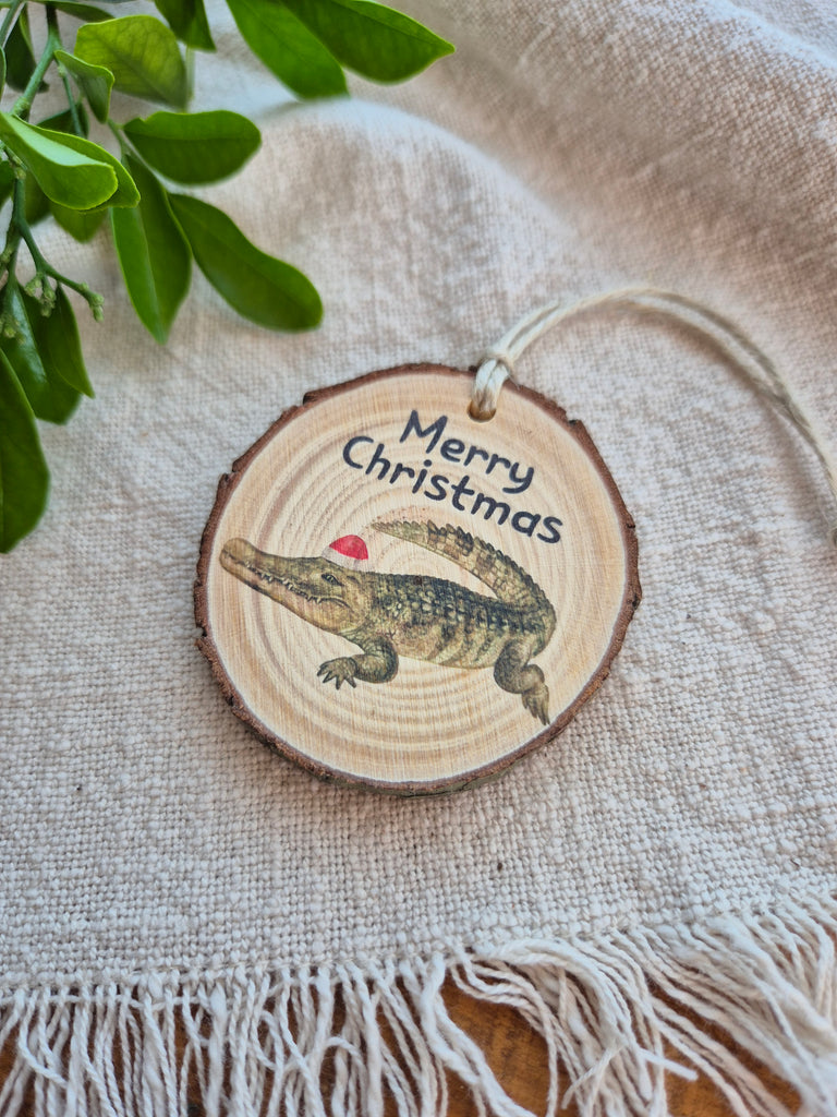 Our tree slice Christmas ornaments make the perfect teacher / educator / secret santa gift or a family keepsake. There's enough space on the reverse side for you to write a little note. This ornament features our "Merry Christmas" crocodile with a santa hat.